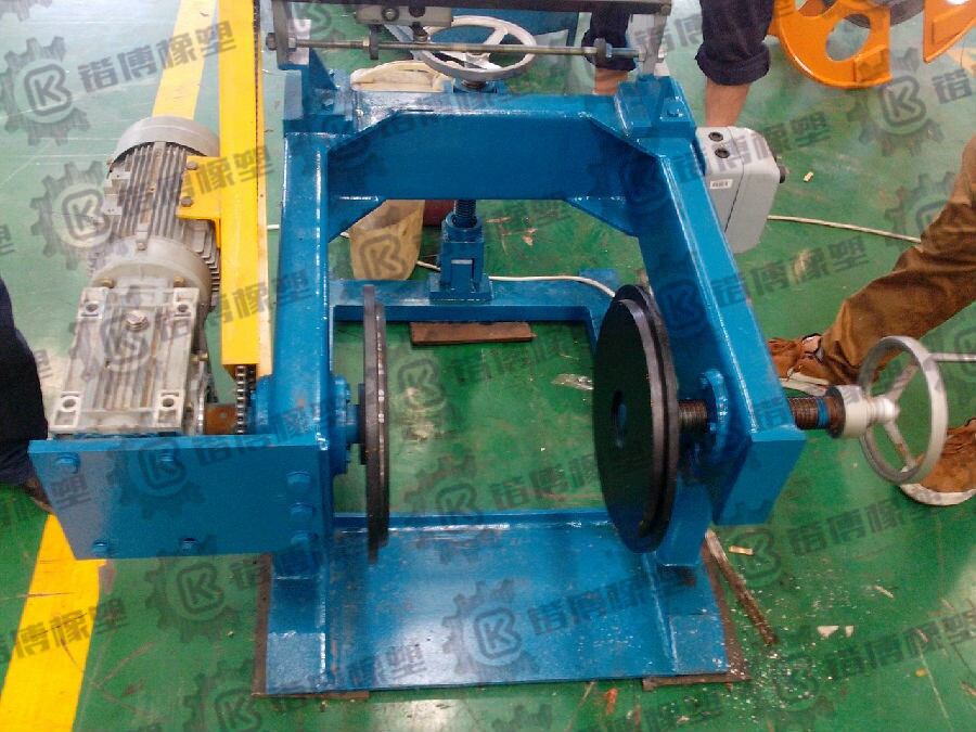 4.3.1?整機(jī)主框架為鋼板和型材焊接而成,通過(guò)一個(gè)伺服電機(jī)直聯(lián)蝸桿減速機(jī)帶動(dòng)一對(duì)嚙合齒輪,以保證上下?tīng)恳喭睫D(zhuǎn)動(dòng),每個(gè)牽引輪各帶動(dòng)一條平皮帶傳動(dòng)。上下有五對(duì)氣缸驅(qū)動(dòng)壓緊裝置滾輪,使平皮帶壓緊電纜。平皮帶間距隨電纜直徑的不同而隨時(shí)變動(dòng),對(duì)于任何外徑的電纜,其中心高度不變。由氣動(dòng)系統(tǒng)均勻的調(diào)整夾緊壓力和控制上下氣缸的氣源。有一單獨(dú)氣缸用來(lái)調(diào)節(jié)上下平皮帶張緊力。牽引裝置兩端均有井式導(dǎo)線裝置,以保證電纜中心位置不變。帶電子計(jì)米。